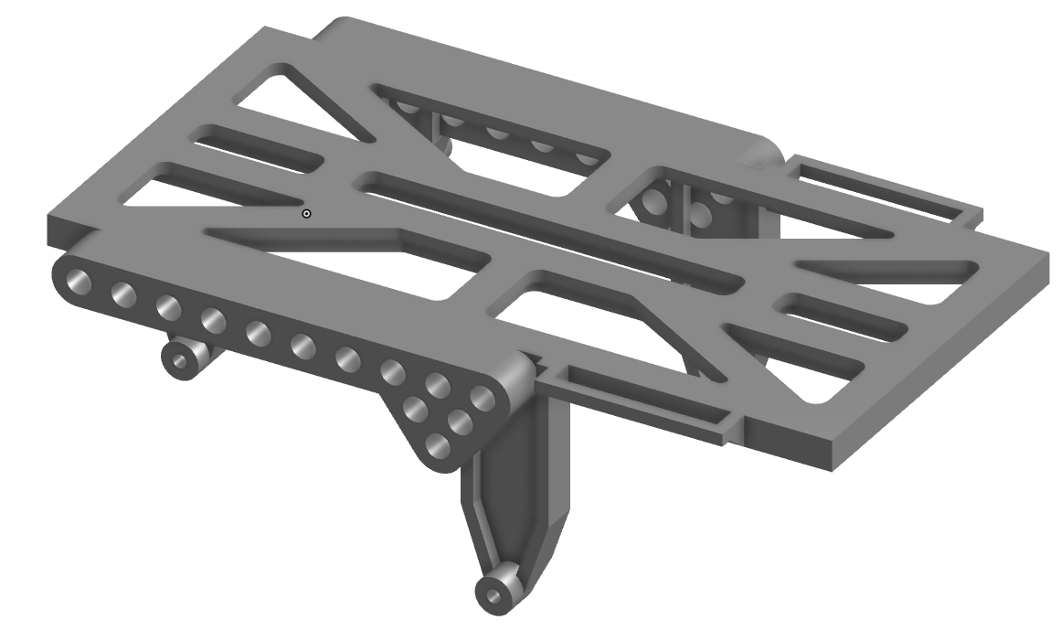 Replacement for the stock battery platform with larger holes for mounting carisma shocks. Many (too many?) options, for you to adjust shock angle based on your preferences.